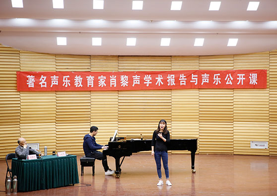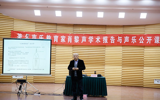 肖黎声教授的讲座围绕歌唱的科学认知与理论声乐建设、歌唱的科学机理与实践训练辨析两大主题展开,从声乐学科发展的历史背景切入,就民族声乐发展前景等问题展开讨论,深入剖析民族声乐与世界声乐的发展潮流与趋势。讲座通过幻灯片展示、声像资料以及亲身示范演唱等方式,使抽象的声乐理论变得鲜活直观,阐释了歌唱的发声原理,并对声乐艺术中的相关概念做了精准诠释,厘清了人们以往在声乐艺术中技术方面存在的模糊认识,剖析了当今国内声乐艺术教育的症结问题,并提出了现实可行的解决方式和手段。公开课中,肖黎声对我校音乐学院、音乐教育学院的8名声乐专业本科生、研究生的演唱进行了现场指导,从发声方法、气息运用、对歌曲本身的理解等方面给出了建议。肖黎声的现场教学对提高声乐教师教学方法的科学性和教学水平及声乐专业学生的歌唱技能和艺术修养具有积极指导意义,使在场师生受益匪浅。