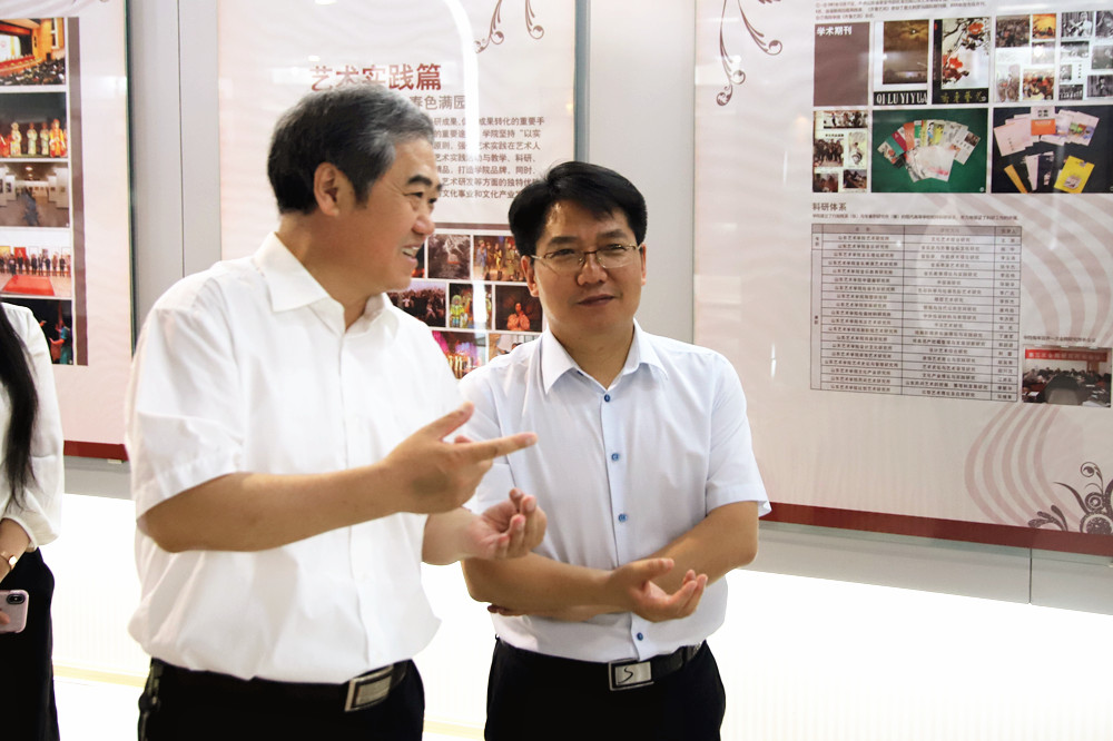 调研过程中,邓云锋不时与学校领导交流,了解学校办学情况,询问发展中遇到的实际问题。校领导从办学特色、人才培养、专业建设等方面向邓云锋一行介绍了学校基本情况,重点介绍了学校围绕服务新旧动能转换重大工程、乡村振兴战略,开展专业建设和教学工作情况和艺术实践等方面的情况及取得的成绩。