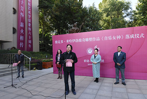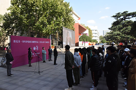 王力克代表学校向雕塑创作者维克多·舒瓦洛夫和雕塑捐建方北京众美集团,表示衷心的感谢。他指出,维克多·舒瓦洛夫应邀来我校进行艺术交流期间,适逢我校60周年校庆工作筹备阶段,为了增加校园艺术氛围,由维克多·舒瓦洛夫负责创作《音乐女神》。雕塑设计制作历时近6个月,在美术学院雕塑系师生的配合下,64岁的维克多·舒瓦洛夫付出大量心血,潜心制作,保证了雕塑作品的高质量完成。王力克希望青年学生们勤于学习,善于思考,勇于探索,学习老艺术家在艺术创作上精益求精的精神,将艺术传承作为毕生的事业。