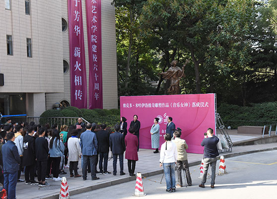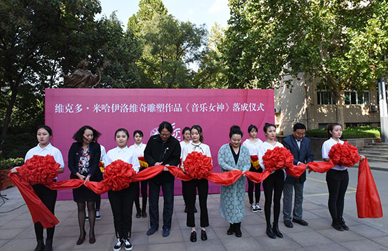 10月17日下午,俄罗斯艺术联盟雕塑家维克多·舒瓦洛夫雕塑作品《音乐女神》落成仪式在文东校区艺术剧场前广场举行。北京众美集团艺术小镇董事长赵婕、我校院长王力克、党委副书记孔祥华出席仪式。党办院办、宣传部、后勤管理处、国际交流合作处、校庆办等部门负责人,音乐学院、现代音乐学院领导班子及师生代表100余人参加落成仪式。仪式由我校设计学院党总支书记、校庆办副主任王大海主持。