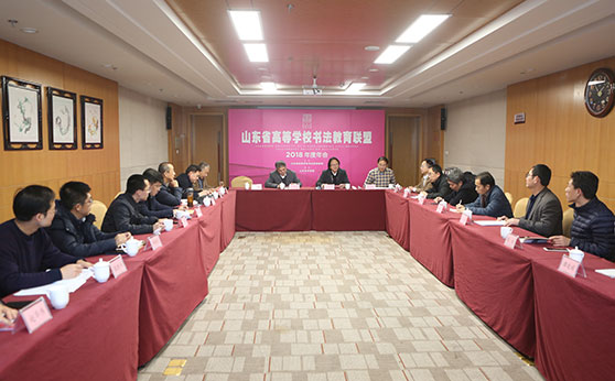 11月19日,由山东省高等学校书法教育联盟主办、山东艺术学院承办的山东省高等学校书法教育联盟2018年度年会在济南召开。中国书协理事、山东省书协常务副主席兼秘书长孟鸿声,山东艺术学院党委书记马东骅、院长王力克,曲阜师范大学书法学院党委书记姜晓强、副院长陈涛、教授朱乐朋、副教授徐传法,临沂大学美术学院书法系副教授房彬、教师张超,山东建筑大学艺术学院副教授谭延祯,齐鲁师范学院美术学院院长李广平,山东工艺美术学院造型艺术学院教师杨国栋,齐鲁理工学院艺术学院院长张胜利、教师赵华伟、李胜伟,山东艺术学院美术学院党总支书记常勇、书法工作室主任于明诠、副教授陈靖、教师贾长庆、杨建虎等出席会议。