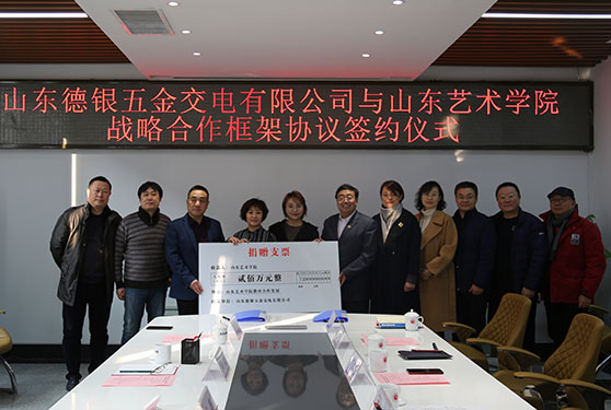 1月10日,山东德银五金交电有限公司与山东艺术学院战略合作框架签约仪式在文东校区综合楼二楼会议室举行。山东德银五金交电有限公司总经理杨新、企业法人韩凤、财务总监杨阳、委托负责人杨光东,我校党委副书记孔祥华,党委宣传部、学生工作处、艺术实践与创作处、财务处、职业教育学院负责人出席签约仪式。