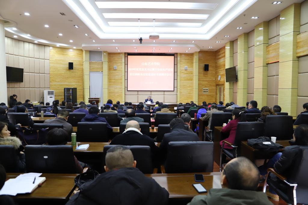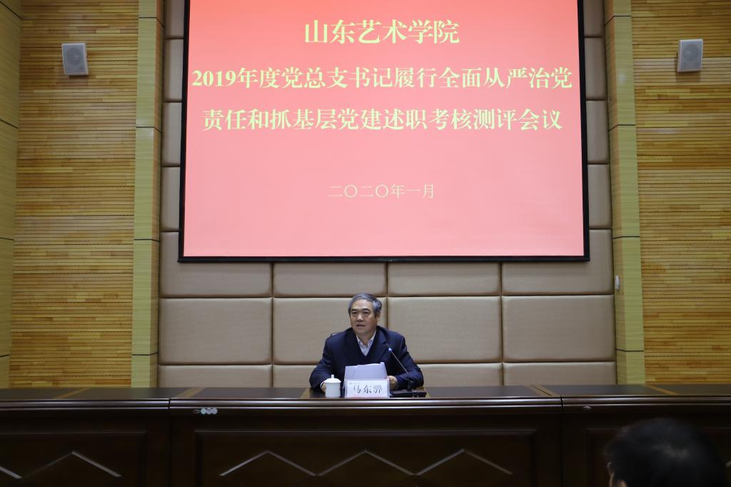 在听取了各党总支书记述职后,马东骅作点评讲话,肯定了各党总支书记2019年履行全面从严治党责任和抓基层党建工作取得的成绩以及所做的贡献。他指出,2019年是学校党建工作和各项事业发展任务都非常繁重的一年,也是各方面工作成绩十分突出的一年。全校基层党建工作成效,主要体现在三个方面。一是以初心使命为引领,扛起了主体责任。各党总支高度重视,把党建工作列入重要议事日程;党总支书记坚定负起第一责任,班子成员认真履行“一岗双责”,针对存在的问题和不足,着力抓整改、抓推进、抓提升。全校形成了“书记抓、抓书记、一级抓一级,层层抓落实”的党建责任传导链条,主体责任得到有效落实。二是以主题教育为契机,抓出了质量成效。各党总支将党建工作与中心工作同部署、同谋划,把抓好党建工作同推动当前工作结合起来,做到了双融合、双促进。特别在主题教育中,全校17个党总支既认真落实“规定动作”,又精心做好“自选动作”,做了大量有特色有亮点的工作,进一步提升了学校党的建设质量。三是以促进工作为目的,推动了事业发展。学校被列为山东省重点高校,博士授予单位申建工作取得重要成效,山艺设计制作的国庆70周年山东彩车“国泰民安”在天安门广场隆重登场,全国专业艺术、美术院校中第一个书法学院在山艺揭牌成立,学校电影艺术产学研基地在青岛西海岸新区破土奠基,等等,都说明了学校以高质量党的建设全面推动了事业高质量发展。马东骅同时指出了学校各基层党组织在履行全面从严治党责任和抓基层党建工作中存在的一些问题和不足,并指明了今后的努力方向。