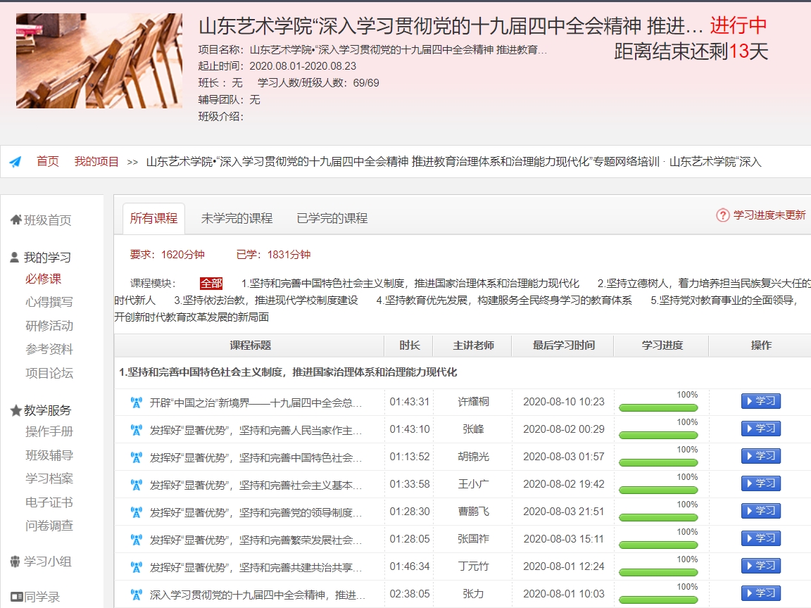 为深入学习贯彻党的十九届四中全会精神, 8月1日至7日,学校举办了“学习贯彻党的十九届四中全会精神 推进教育治理体系和治理能力现代化”专题网络学习培训班。全校69名副处级干部参加学习培训。
