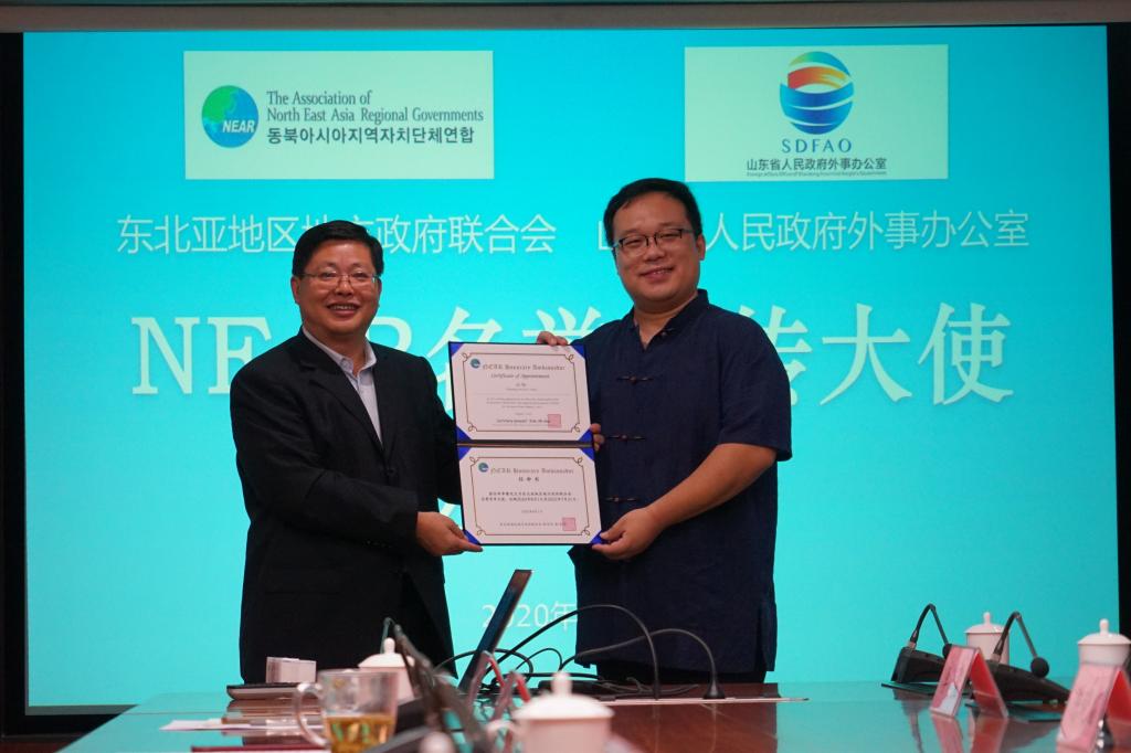 在授予仪式上,山东省人民政府外事办公室副主任孙业宝向李鳌、徐丹颁发了名誉大使聘书和名片。他们表示要勤勉工作,不辱使命,为推动东北亚地区地方政府间的交流与合作不遗余力地奉献自己的力量。