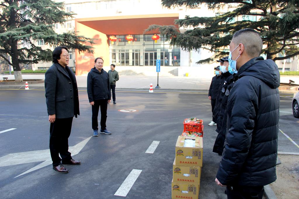 王力克一行来到文东校区保健科卫生室、学生公寓及校门值勤室,长清校区办公楼值班室、校门值勤室、教职工宿舍物业值班室等处,与值班人员亲切交谈,悉心询问大家的工作、生活等情况,并送上慰问品。听取了相关负责人的工作汇报,了解节日期间的疫情防控、安全保卫、后勤保障等情况,感谢他们“舍小家、为大家”放弃假期休息时间坚守岗位,为学校后勤保障和安全稳定工作作出的贡献,向他们致以新年问候和美好祝福;叮嘱他们在做好疫情防控的前提下,发扬“老黄牛”吃苦耐劳的精神,以高度的责任感和使命感,守卫学校和师生的安全。