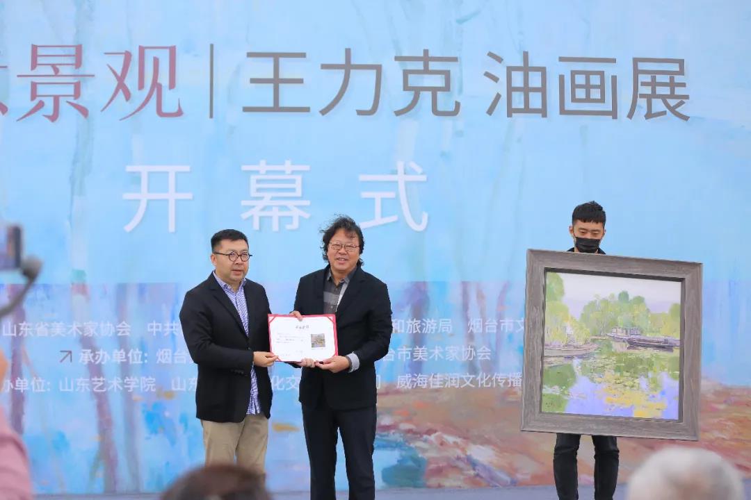 开幕式上,王力克教授为烟台美术博物馆捐赠作品《湖光春意》。他在答谢辞中表示,非常激动来到自己成长的故乡——烟台。艺术道路艰苦,感谢那些带我们入门、教我们成长的老师。文化自信从审美开始,从美育开始,艺术家的心态应是养育生生不息的生命,作为一位美术教育者,作为一个油画家,希望能和前辈们一样把所学所感奉献给养育自己的这片土地,传承下去。这是所有从艺者的责任。