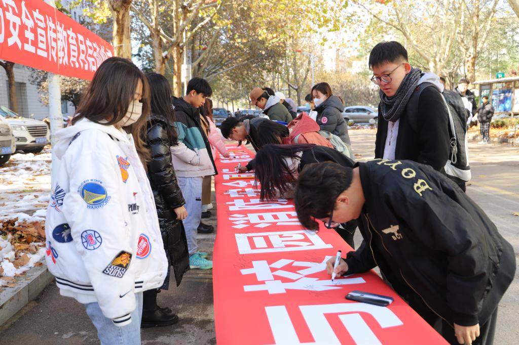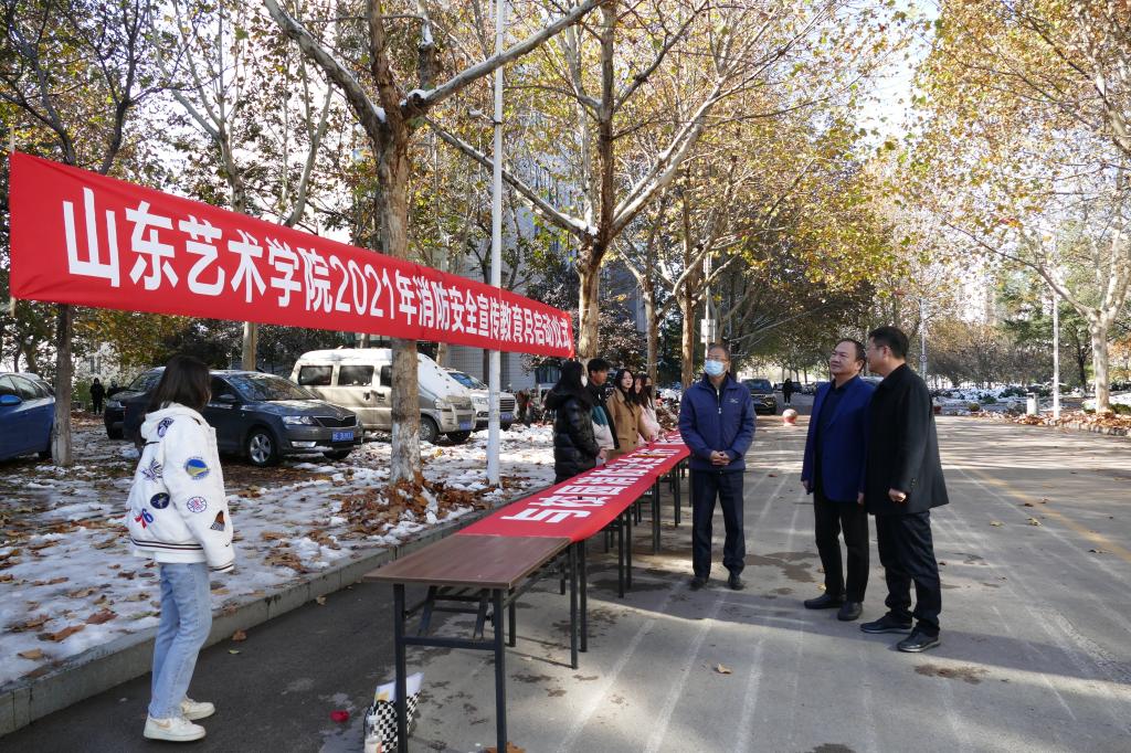 11月9日,我校在长清校区食堂前广场举行“与校园消防安全同行,防患于未‘燃’”消防宣传日主题签名活动,拉开了我校2021年“消防安全宣传教育月”活动的序幕,副院长兰绍彤和学校各二级单位负责同志、长清校区师生参加活动,并现场签名。