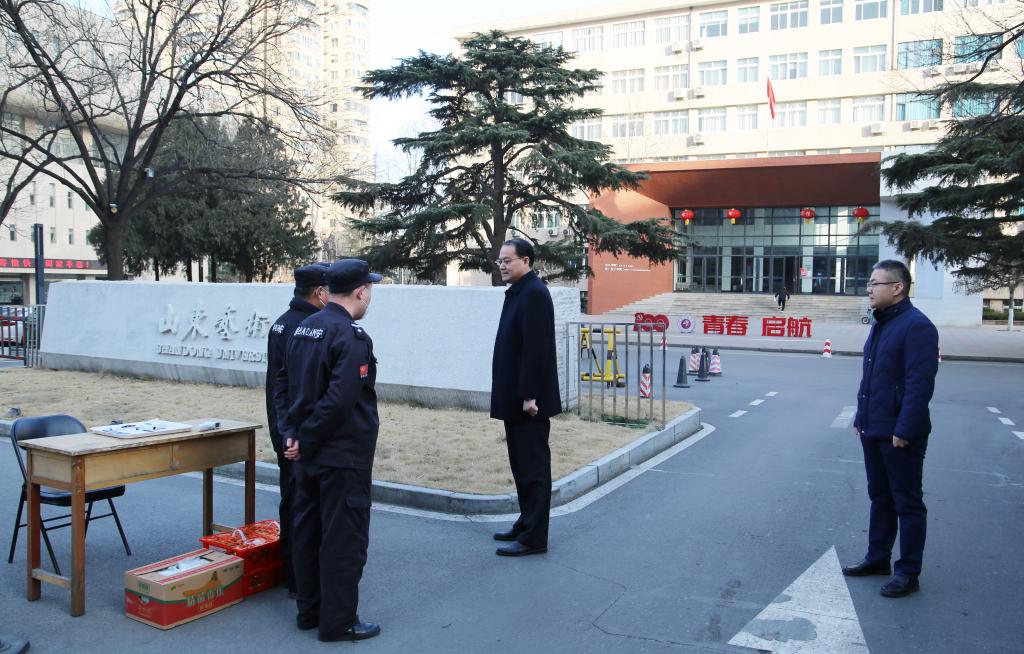 王洪禹一行来到文东校区保健科卫生室、学生公寓及校门值勤室,长清校区校门值勤室、办公楼值班室、学生公寓值班室等处,看望坚守岗位的干部职工,为他们送上节日慰问品。每到一处,校领导都与值班干部职工亲切交流,悉心询问大家的工作、生活等情况,详细了解节日期间的疫情防控、安全保卫、后勤保障等工作开展情况,对他们恪尽职守、严谨规范地开展工作给予高度认可,对他们爱岗敬业的态度和乐于奉献的精神给予充分肯定,并勉励大家保重身体,全力以赴做好各项服务保障工作。