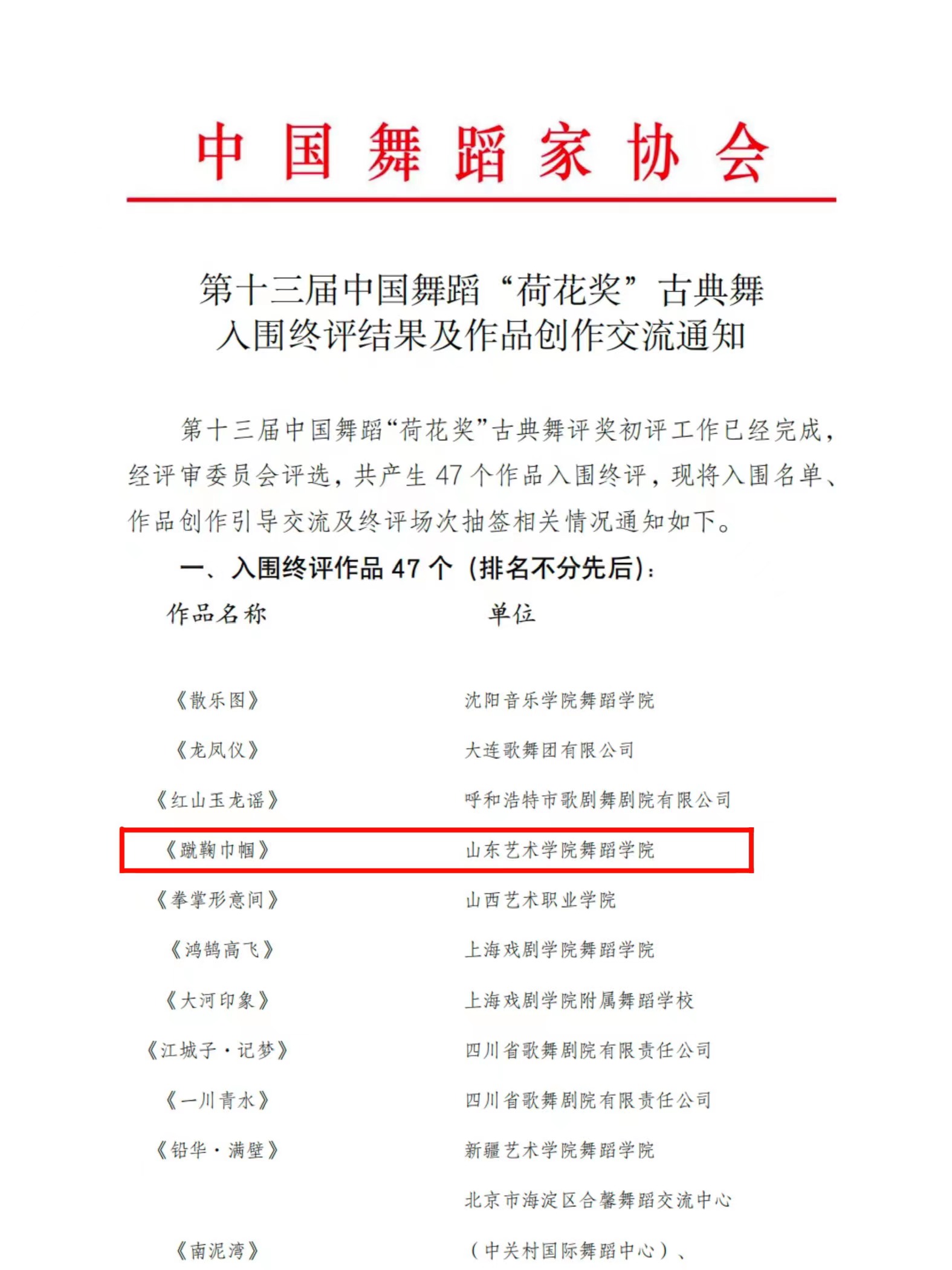 近年来,学校采取有力举措,积极支持师生在高水平活动参与、高层次展演获奖上实现新突破,多部优秀舞蹈原创作品在国家级比赛中屡获佳绩。此次入围第十三届中国舞蹈“荷花奖”古典舞终评是对我校青年教师专业技能与创作水平的又一次肯定与认可,也是学校大力推动高水平艺术创作、积极打造艺术精品取得的又一重要成果。