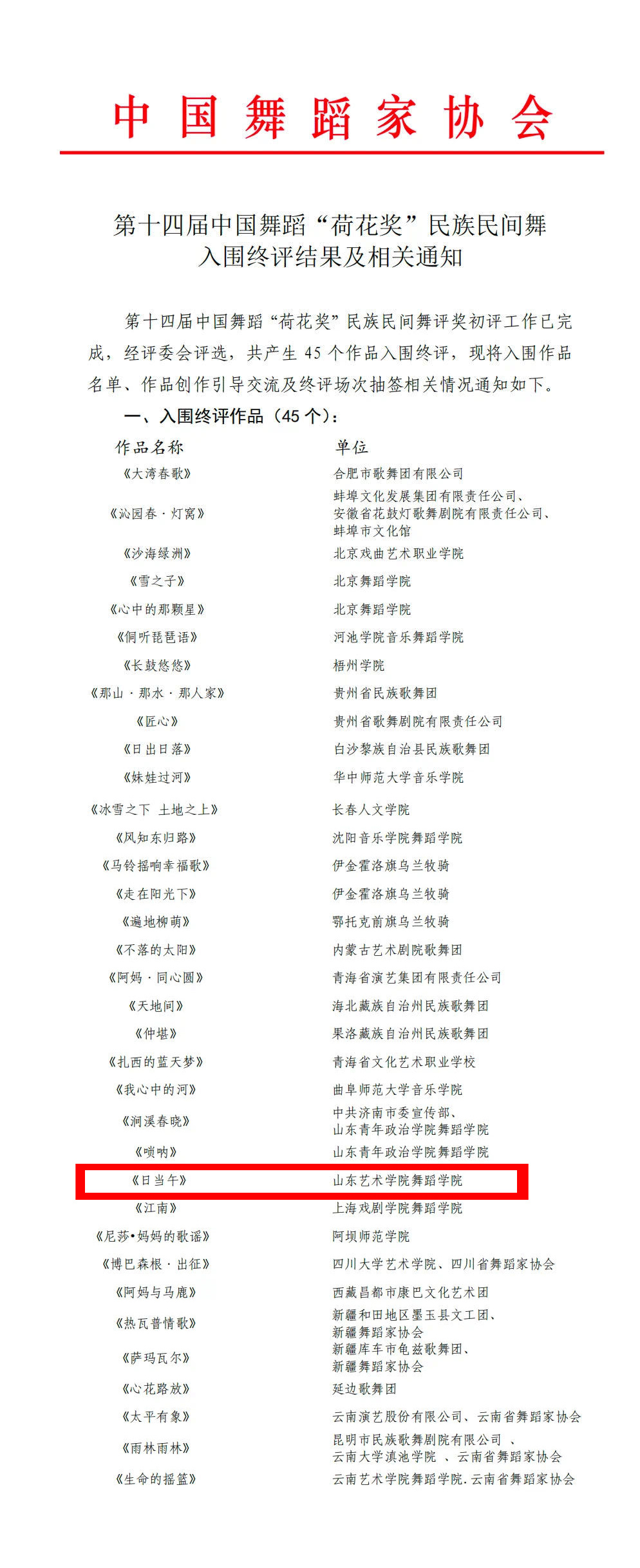 7月19日,中国舞蹈家协会公布第十四届中国舞蹈“荷花奖”民族民间舞入围终评名单,舞蹈学院原创作品《日当午》入选,这是2023年度继“荷花奖”当代舞、现代舞入围终评后,我校舞蹈作品又一次成功入选。