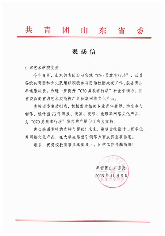 近日,共青团山东省委致信学校党委,对我校团委在“070勇敢者行动”中的大力支持表示感谢,同时对我校师生在这一活动中的积极参与和创造力展现表示充分肯定,并给予高度评价。
