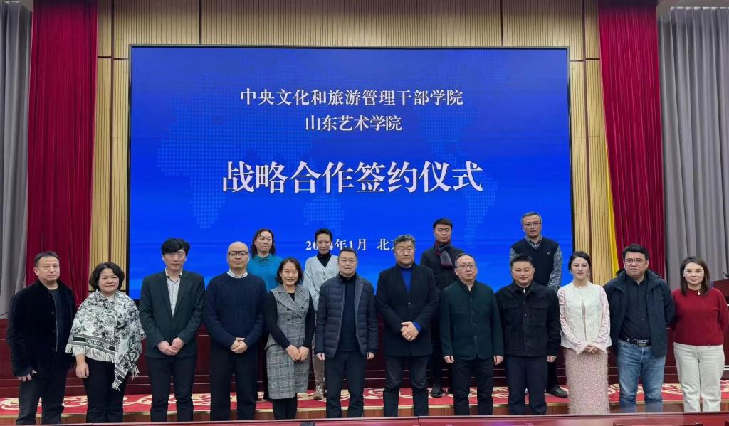 1月5日,我校与中央文化和旅游管理干部学院在北京签订战略合作框架协议。中央文化和旅游管理干部学院党委书记喻剑南,党委副书记、院长马峰,山东艺术学院院长徐青峰出席签约仪式。