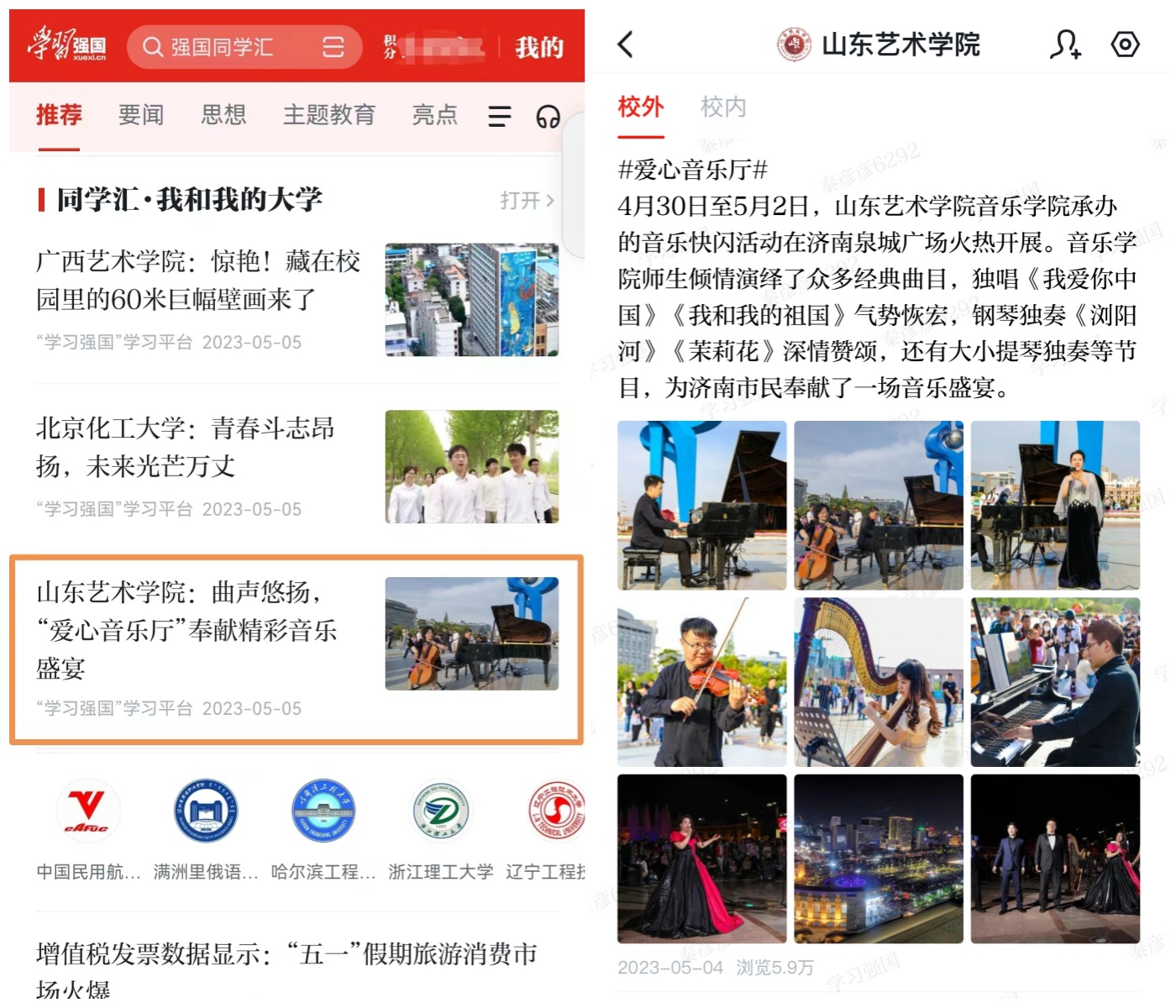 近日,山东艺术学院在“学习强国”同学汇工作中表现突出,被评为“学习强国”同学汇2023年度先进单位,作品《音乐快闪活动在济南泉城广场火热开展》荣获2023年度“学习强国”同学汇人气作品。