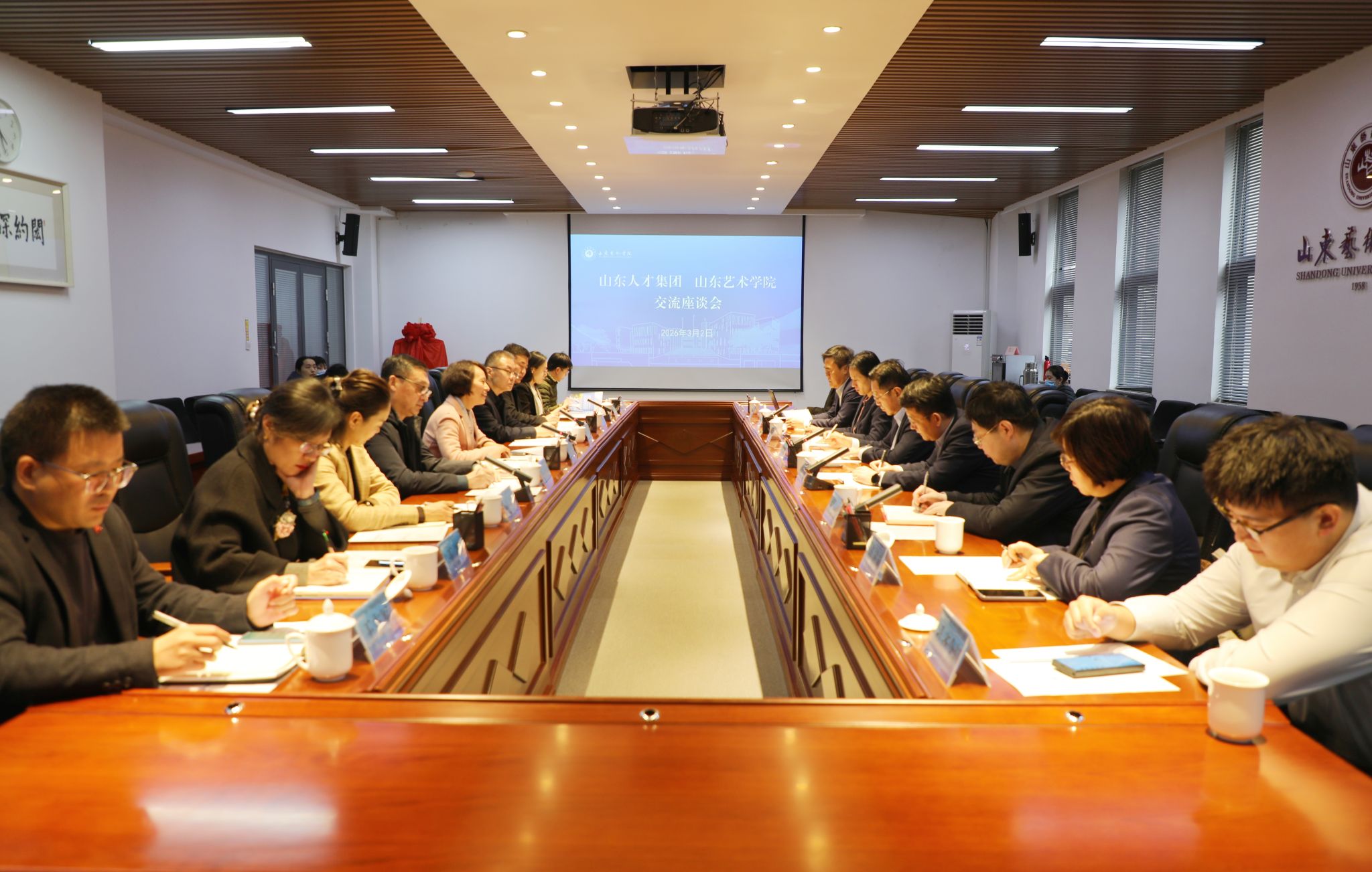 徐梅代表学校对客人的到来表示热烈欢迎,详细介绍了学校在艺术人才培养、学科专业建设、服务文化强省建设等方面的特色优势与发展成效。她表示,此次交流是深化产教融合、推进协同育人的重要契机,期待以此次座谈为起点,与民政厅及山东人才集团在基金会规范建设、校友资源凝聚、人才引育、就业服务、项目落地等方面深化务实合作,实现资源共享、优势互补,共同培养适应新时代需求的高素质艺术人才。
