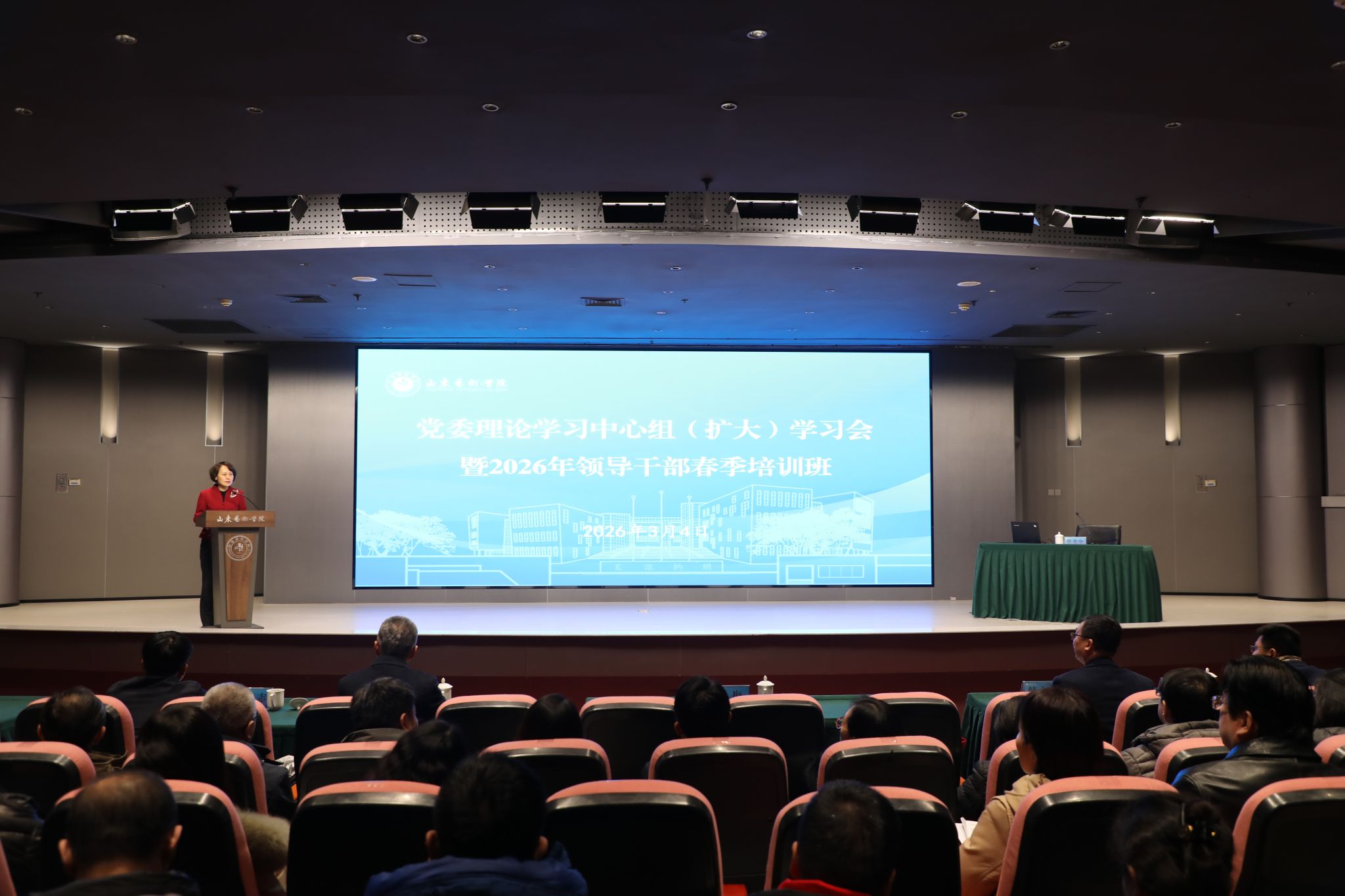 3月4日,学校党委理论学习中心组(扩大)学习会暨2026年领导干部春季培训班在长清校区举行开班式,党委书记徐梅主持开班式并讲话。党委副书记苏茂兴,党委委员、副院长韩文涛,党委委员、纪委书记、省监委驻校监察专员周立志,党委委员、宣传部部长孔宪坤出席开班式,全体科级以上干部、二级学院系(部)主任参加培训。