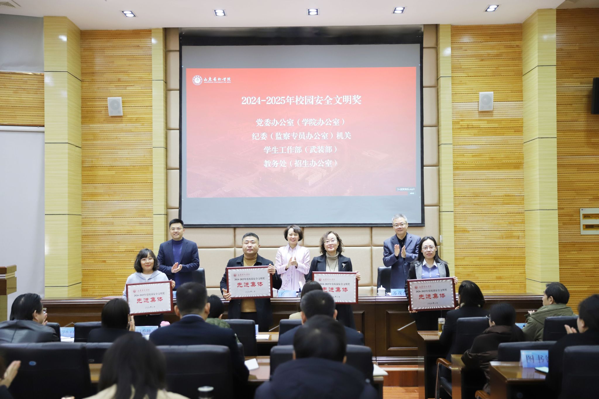 会上表彰了学校2024-2025年度校园安全文明奖获奖单位,党办院办、学生工作部、现代音乐学院、书法学院等获奖单位代表交流发言,安全保卫部负责人总结2025年校园安全工作,对2026年校园安全重点工作进行安排部署。
