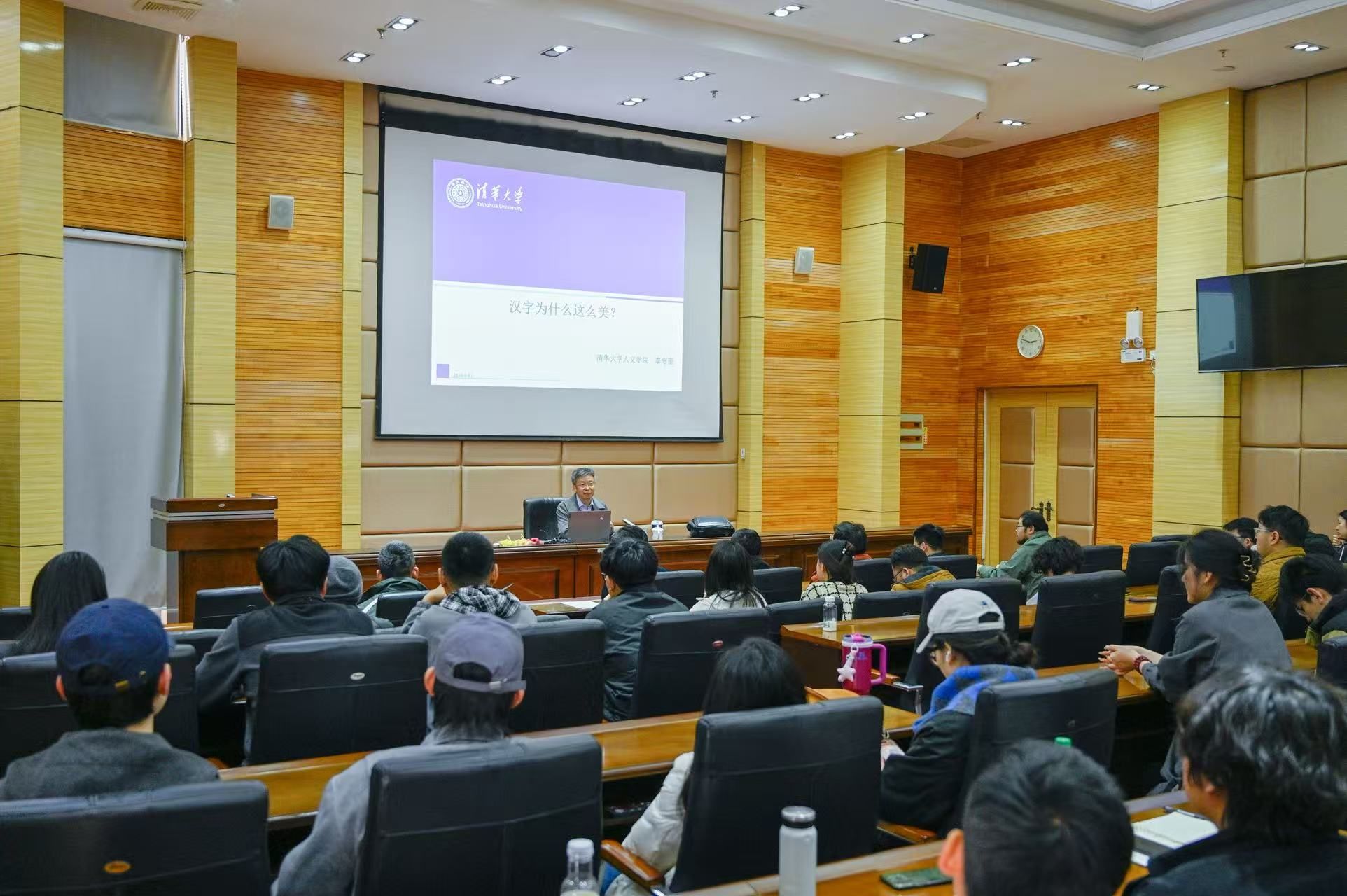 会见后,李守奎教授作了《汉字为什么这么美》专题讲座。他将古文字专业知识与艺术审美相结合,从“独存至今的古典表意字”“汉字的独特性”“汉字之美”等方面深入浅出地阐释了汉字的形体、文化与功能之美,同时阐明了古文字研究在当代书法篆刻创作中的应用路径。