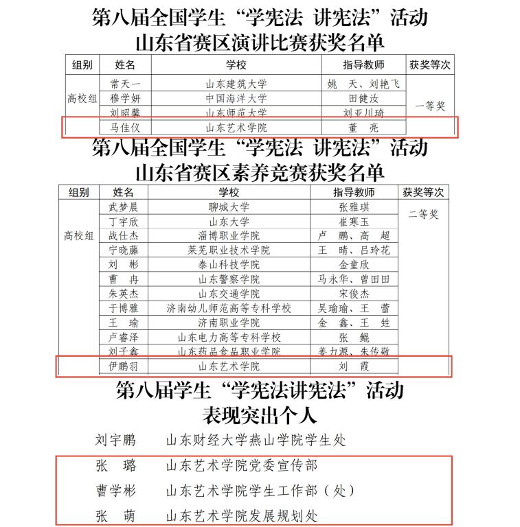 近日,山东省教育厅公布第八届学生“学宪法 讲宪法”活动开展情况,我校戏剧学院播音与主持艺术专业2022级本科生马佳仪荣获演讲比赛高校组一等奖,艺术管理学院艺术管理专业2021级本科生伊鹏羽荣获素养竞赛高校组二等奖,张璐、曹学彬、张萌等3名教师被评为“表现突出个人”。