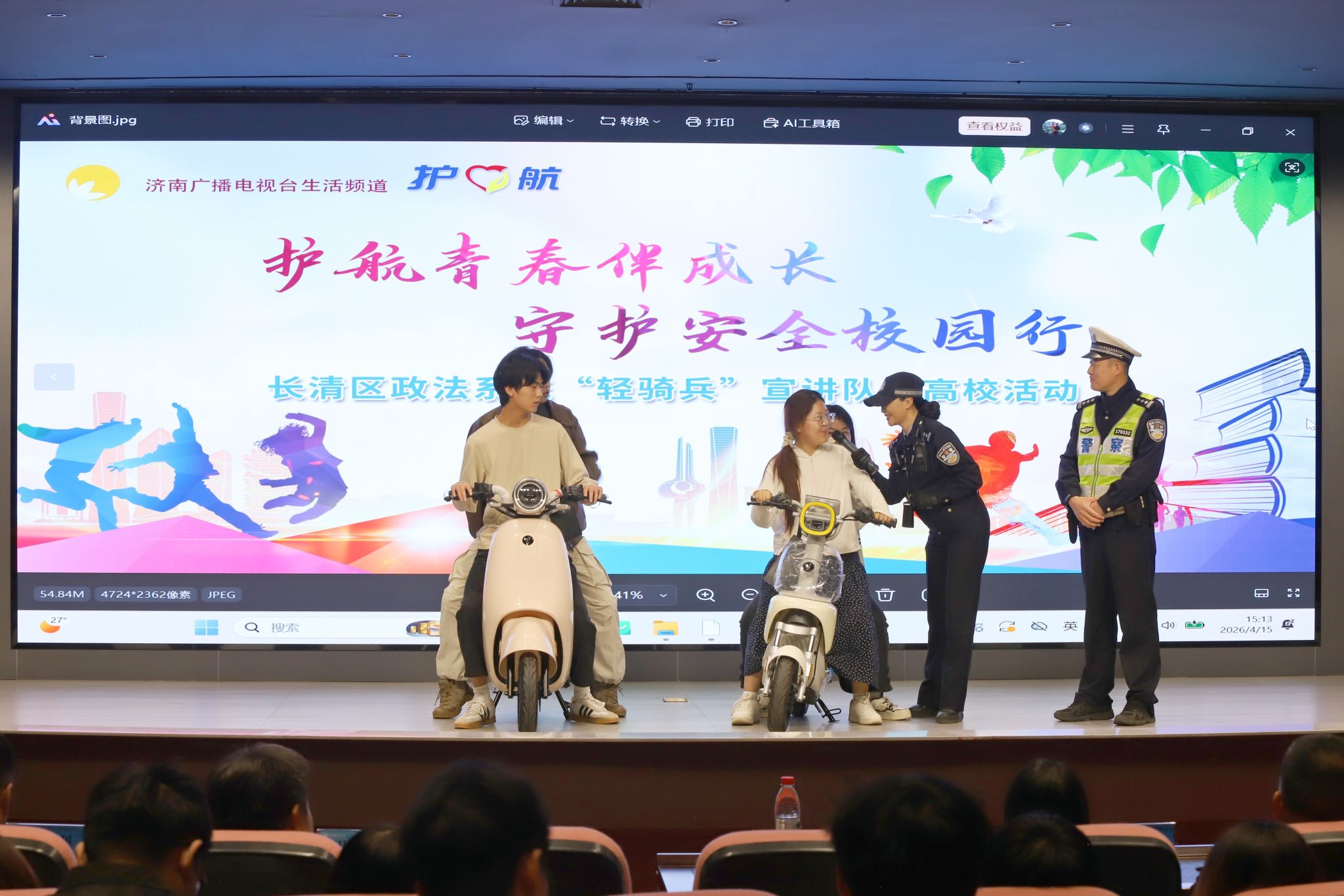 长清区委政法委、区法学会、高级警长驻高校工作专班等相关负责同志,我校安全保卫部、团委负责同志,部分二级学院党组织书记、副书记及师生代表现场参与活动。活动同步在济南广播电视台生活频道“交通进行时”视频号直播。
