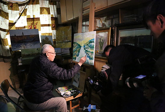 两天的采访中,剧组就创作缘起、创作过程、心得体会、历史画观等方面对路璋教授进行了采访。早在1979年,路璋教授便开始创作以革命烈士王尽美同志为题材的美术作品。为了创作这些作品,路璋先后到诸城北杏村、青岛四方机厂、淄博矿区、济南市原省委秘书处旧址、当年在国货商场演讲的戏台、老泺源桥、长辛庄铁路机厂、山海关和上海中共一大会址等王尽美同志家乡和工作、生活过的地方进行采风和写生,积累了大量素材。30多年中,他创作了《王尽美——中共一大代表》(组画)《王尽美在青岛》《尽善尽美唯解放》《醒狮》《乾坤孰掌问吴苍》《列宁会见王尽美、邓恩铭》《唤起民众》《山东第一个共产主义小组成立》等许多优秀油画作品,并无偿捐献给全国各地的王尽美纪念馆和故居,20多件作品被山东党史纪念馆永久收藏,《醒狮》入选第六届全国美展获优秀奖并被中国美术馆收藏。