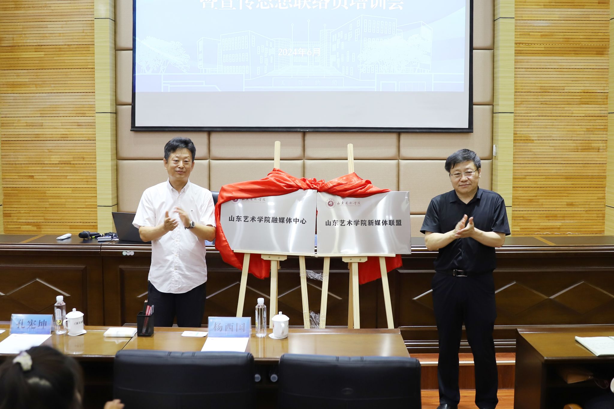 宋全政、杨西国共同为“山东艺术学院融媒体中心”“山东艺术学院新媒体联盟”揭牌。