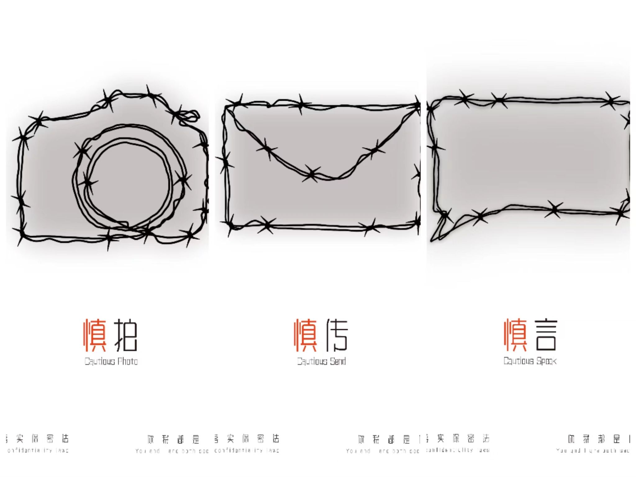 作品《慎》以铁丝为灵感,结合照片传播、文件传播、语言传播三种经典传播方式,将铁丝编织成浅显易懂的对应图形,以直观的形态提醒人们要严守国家秘密,慎拍、慎传、慎言。
