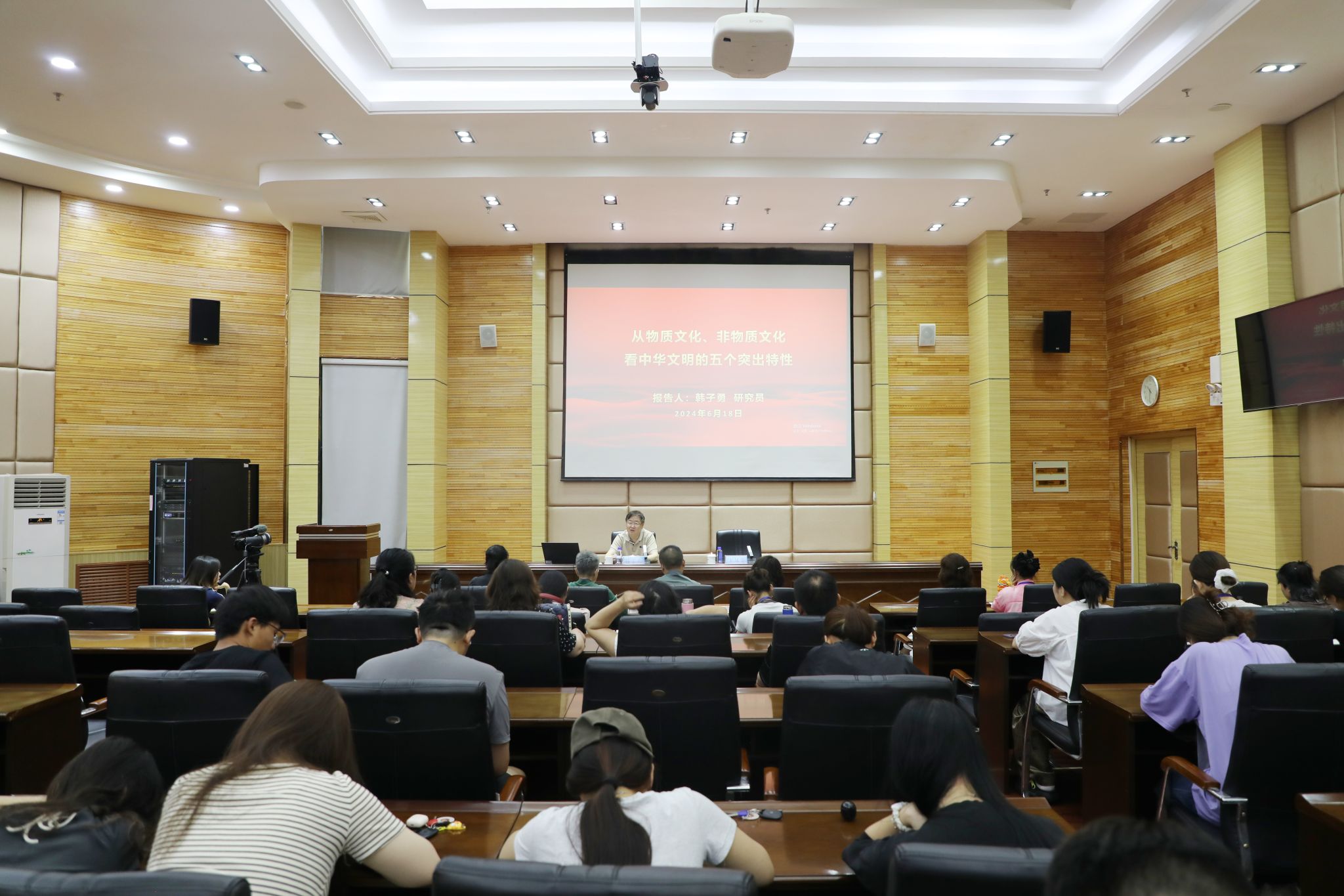 韩子勇以《从物质文化、非物质文化看中华文明的五个突出特性》为题,围绕习近平总书记在文化传承发展座谈会上的重要讲话精神,解读阐释了中华文明的特性,即“生生不息”的连续性、“其命维新”的创新性、“以中为中”的统一性、“和而不同”的包容性、“上善若水”的和平性,并强调五个突出特性不是孤立存在的,而是有深刻联系和内在逻辑。