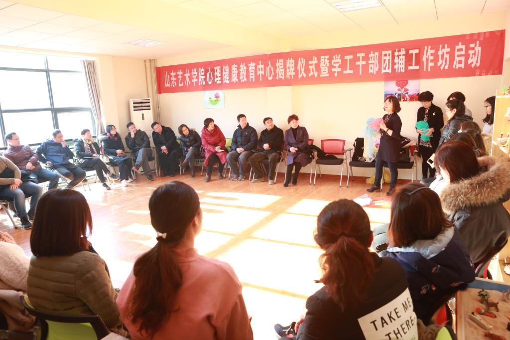 12月18日,山东艺术学院心理健康教育中心揭牌仪式暨学工干部团辅工作坊系列活动,在长清校区学生公寓一号楼心理团辅室举行。校党委副书记孔祥华,山东省心理健康教育研究会副会长苏琪,山东心理学会副理事长赵富才,各二级学院党总支副书记、全体辅导员,学生处工作人员参加活动。