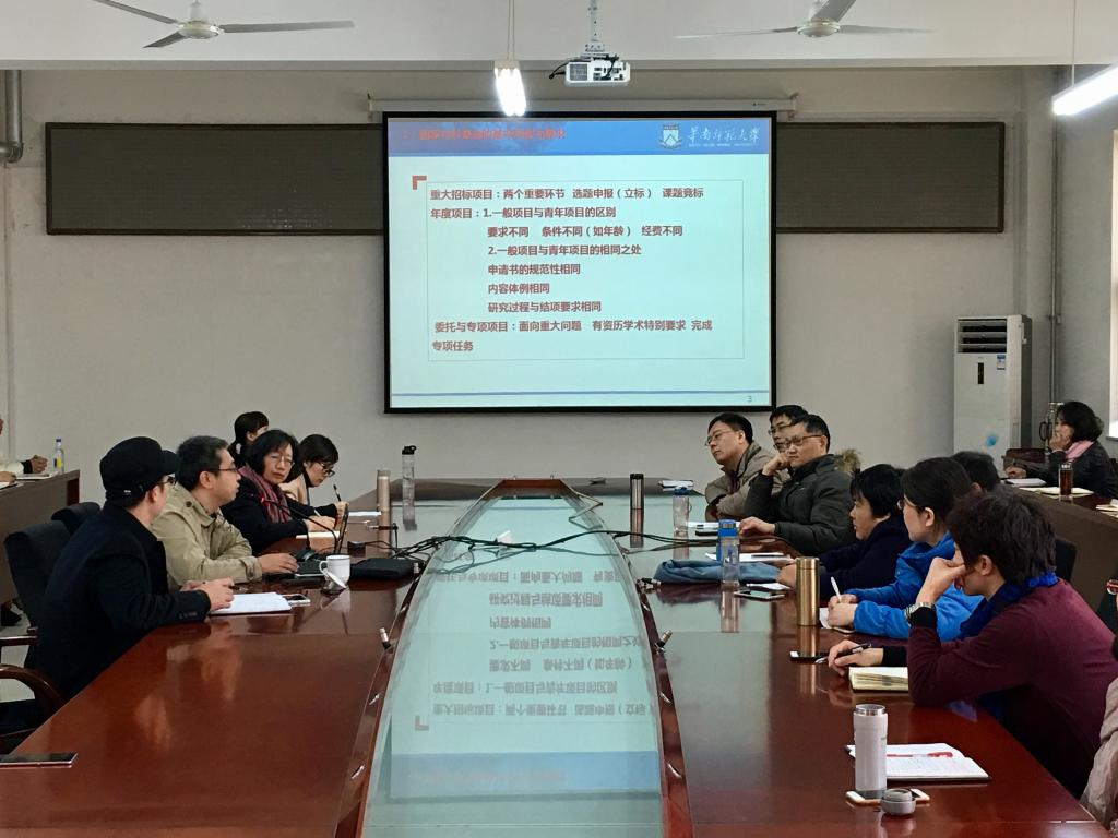 段吉方教授是国家社科基金重大招标项目首席专家,主持多项国家社科基金项目,有着丰富的国家社科基金项目申报经验和评审经历。在讲座中,段教授结合艺术院校实际,对国家社科基金项目的类别、评审程序、评审要求、常见问题等方面进行了讲解,并重点就课题申报书中数据表、课题论证、活页等内容在填报时需要注意的问题做了详细说明。与会各二级学院教师就近年来在申报国家社科基金项目中遇到的问题,与段教授进行了交流。