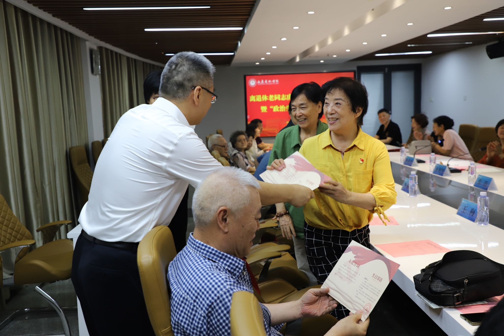 苏茂兴现场向19名老党员颁发了“政治生日贺卡”,并代表学校党委向老党员表示热烈祝贺和崇高的敬意。他强调,老党员是学校历史的见证者、参与者,更是学校精神的传承者。老同志们退休后仍不忘初心、牢记使命,在助力青年师生成长成才、丰富校园文化等方面书写着老有所为的新篇章。在中国共产党成立103周年的日子里颁发政治生日贺卡,展现了党组织对老党员的关心厚爱,更是对老同志为党为国为学校艰苦奋斗、无私奉献的肯定。希望广大老党员认真学习习近平新时代中国特色社会主义思想,一如既往支持拥护党的建设发展,珍惜光荣历史、永葆政治本色。年轻党员要以先辈为标尺、向先进看齐,继承和发扬老党员的优良作风,弘扬建党精神,赓续红色基因,为共产主义事业奋斗终身。