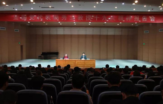 杨秀玉教授以《新时代 新思想 新征程》为题,结合亲身学习体会畅谈了党的十九大精神。她从大会主题——不忘初心,牢记使命,高举中国特色社会主义伟大旗帜,决胜全面建成小康社会,夺取新时代中国特色社会主义伟大胜利,为实现中华民族伟大复兴的中国梦不懈奋斗;重大政治判断——中国特色社会主义进入新时代;重大理论创新——习近平新时代中国特色社会主义思想;新愿景开启新征程——“两个一百年”奋斗目标;整体性工作部署——推进新时代中国特色社会主义伟大事业全面发展;建设伟大工程——加强党的建设,全面从严治党等方面,及大会审议并通过了党的十九大报告、十八届中央纪委工作报告、党章修正案,提名并选举了中央委员、候补委员、中纪委委员等关键点,生动形象地宣讲了十九大盛况,传达和宣传了十九大精神。她结合自己作为一名教育工作者和文艺工作者,就“教育”和“文化”两个方面谈了认识,同时从“光荣与使命”“参会行程”“不忘初心、牢记使命”“人民在党心中”“我眼中的领导”“专业知识带给我的骄傲”“感恩”等方面畅谈了参加十九大的感受。