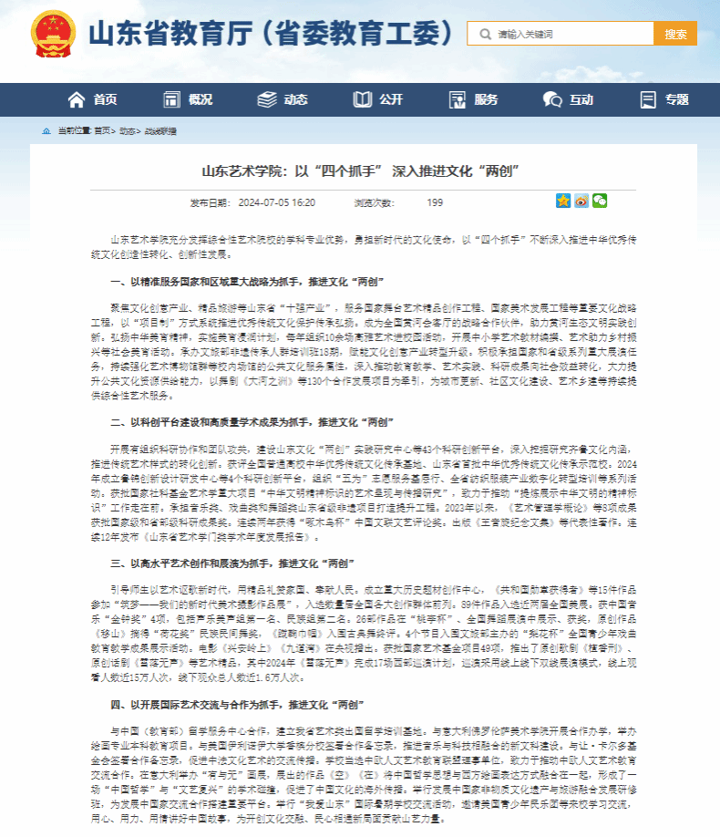 编者按:7月5日,山东省教育厅官方网站“战线联播”栏目刊登我校文章《以“四个抓手” 深入推进文化“两创”》,展示了我校充分发挥综合性艺术院校的学科专业优势,以精准服务国家和区域重大战略、科创平台建设和高质量学术成果、高水平艺术创作和展演、开展国际艺术交流与合作为抓手,深入推进中华优秀传统文化创造性转化、创新性发展的经验做法。
