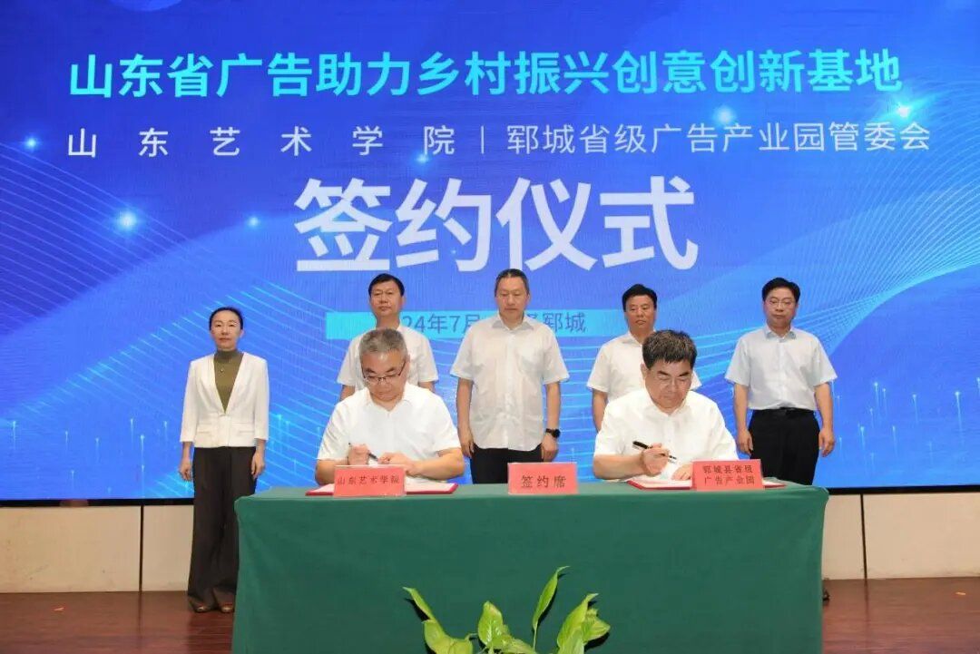 7月3日,山东艺术学院广告助力乡村振兴创意创新基地签约仪式在郓城县举行。期间,召开了山东省2024年“助力乡村全面振兴、献礼新中国75周年华诞”公益广告创新创意大赛暨“泰山杯”、第十四届“学院创意杯”广告大赛工作推进会。山东省政协常委、省市场监督管理局一级巡视员蔡福安,山东艺术学院党委委员、副院长苏茂兴,菏泽市委常委、市政府副市长王昌华,菏泽市政府副市长、郓城县县委书记姜凌刚,山东省市场监督管理局广告处处长魏敬胜,菏泽市市场监督管理局党组书记、局长王敏,山东省政协常委、山东省广告协会会长王百忠,郓城县政府副县长、郓城省级广告产业园管委会主任王永合等出席活动。