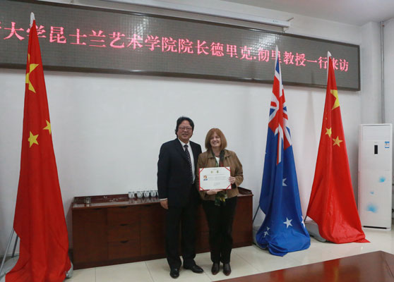 王力克代表学校向德里克.彻里院长,伊丽莎白.范德雷副院长颁发了山东艺术学院客座教授证书。