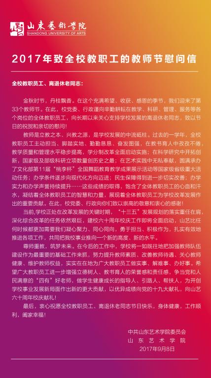 尊师重教,筑梦未来。在今后的工作中,学校将一如既往地把加强教师队伍建设作为最重要的基础工作来抓,努力提升教师素质、改善教师待遇、关心教师健康、维护教师权益,实实在在地为广大教职员工做实事、解难事、办好事。希望广大教职员工进一步增强立德树人、教书育人的荣誉感和责任感,争当党和人民满意的“四有”好老师,做学生健康成长的指导人、引路人、帮扶人,为开创学校事业发展新局面作出新的更大贡献,以优异成绩向党的十九大献礼,向山艺六十周年校庆献礼!