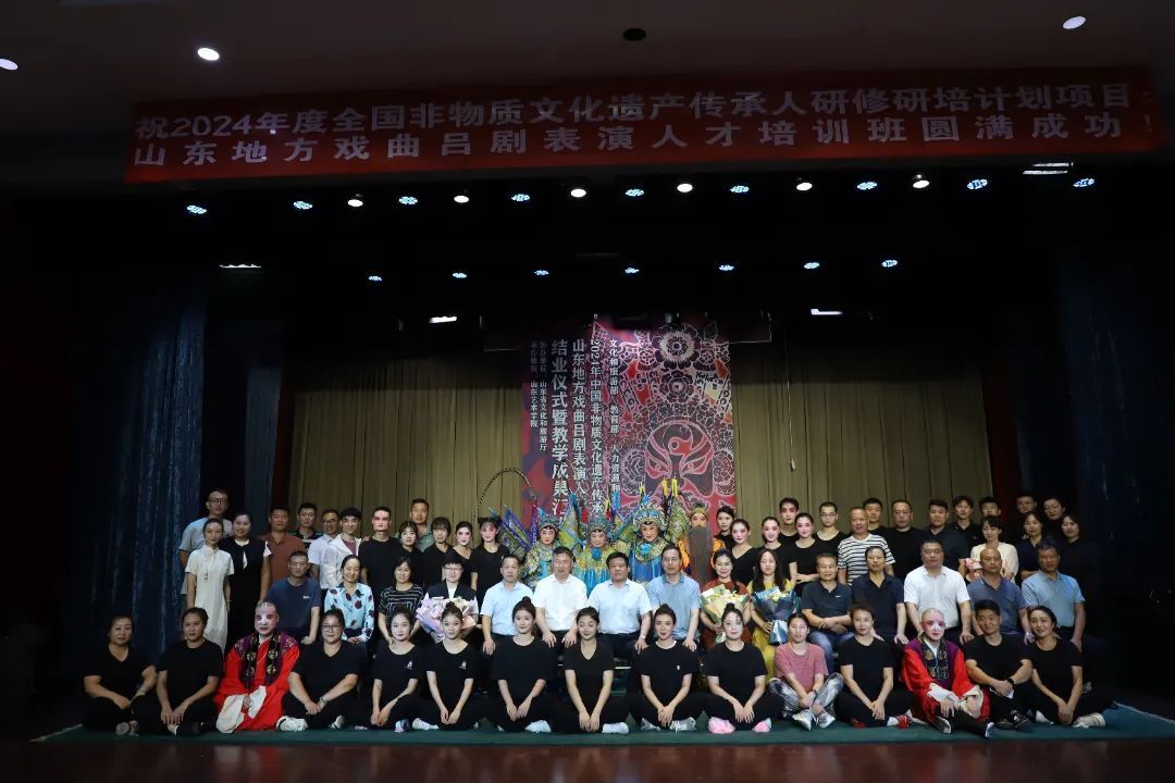 8月12日,我校承办的2024年国家文化和旅游部、教育部、人力资源和社会保障部中国非物质文化遗产传承人研修研培计划项目——山东地方戏曲吕剧表演人才培训班结业仪式暨教学成果汇报演出在长清校区梨园剧场举行。山东省文化和旅游厅非物质文化遗产处二级调研员王尚,学校党委委员、纪委书记、省监委驻学校监察专员周立志出席并致辞。艺术实践与创作处、戏曲与曲艺学院负责人,相关市县区吕剧院团负责人,培训班全体学员和戏曲与曲艺学院师生代表参加活动。