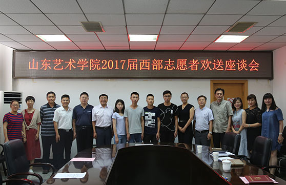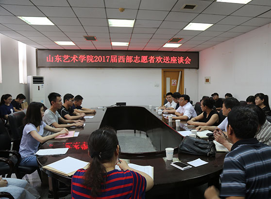 7月4日上午,山东艺术学院召开2017年西部计划志愿者欢送座谈会,欢送即将赴新疆、西藏参加志愿服务和工作的朱瑞、张远明、王彦帅、王竹霖等4名同学。校党委副书记孔祥华,党委宣传部、团委、学生处负责同志和音乐学院、美术学院、职业教育学院党总支书记、团总支书记出席座谈会。座谈会由校团委书记孔宪坤主持。