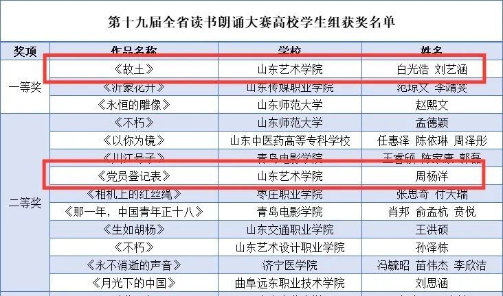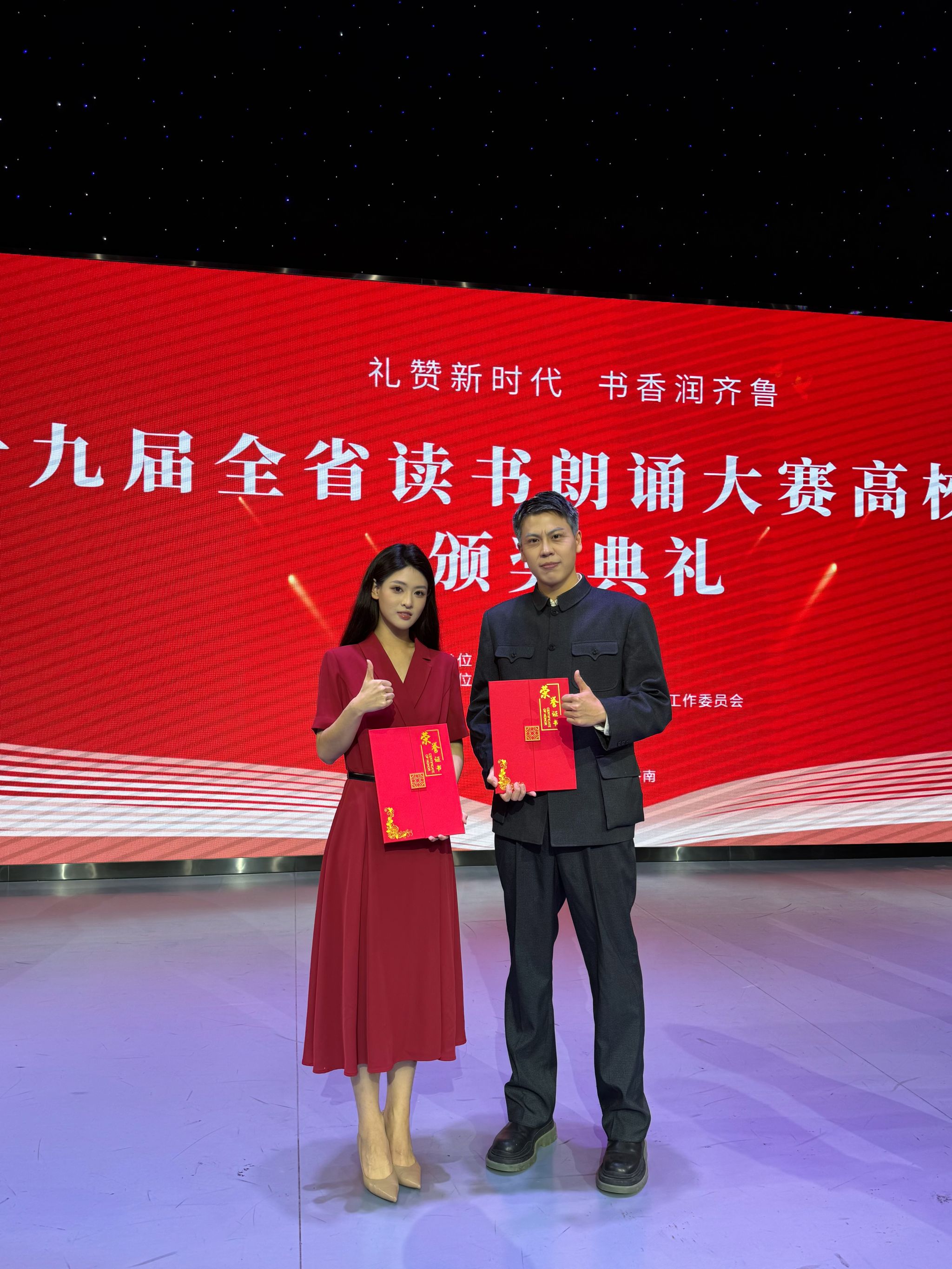 9月24日,由山东省文化和旅游厅主办,山东省图书馆、山东省高等学校图书情报工作委员会、山东师范大学图书馆联合承办的“礼赞新时代·书香润齐鲁”第十九届全省读书朗诵大赛颁奖典礼暨优秀作品展演在山东教育电视台举行。由山东艺术学院戏剧学院院长董亮教授指导,2023级研究生刘艺涵与2022级播音与主持艺术专业本科生白光浩参赛作品《故土》荣获一等奖;由山东艺术学院戏剧学院外聘硕士研究生导师刘元鸣指导,2022级研究生周杨洋参赛作品《党员登记表》荣获二等奖。我校学生现场展演了原创作品《中国梯》。