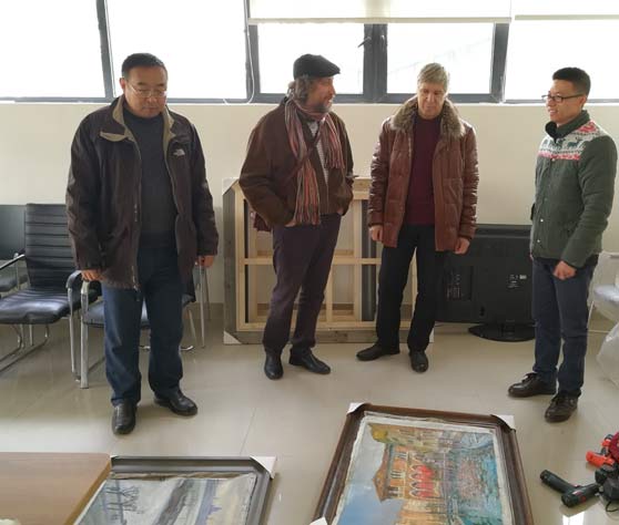 三位画家与美术学院相关负责同志就此次中俄艺术高校联盟系列活动中中俄交流画展的具体事宜进行了工作对接,双方互相介绍了中俄美术教育的现状。美术学院负责同志详细介绍了山东艺术学院美术学院的概况及此次活动的内容。三位俄方画家也对列宾美术学院做了简单介绍,提出了自己的疑问和见解,对学生二年级进行工作室选择的方式提出了不同的看法。中俄双方的画家代表还就接下来的户外写生工作进行了实地取景和构图。