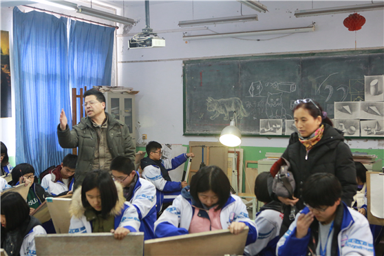 王兴堂和侯弟坤教授在素描课堂指导学生