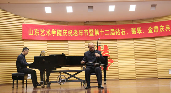 庆典仪式结束后,大家观赏了新、老艺术家们的精彩演出。演出从退休教授张令杰演奏的二胡独奏《欢乐四平调》中拉开序幕,张教授在青年钢伴教师唐庆的配合下将自己创作的作品演绎到极致;老年合唱团演唱的《映山红》和《祖国不会忘记》将演出推向高潮。