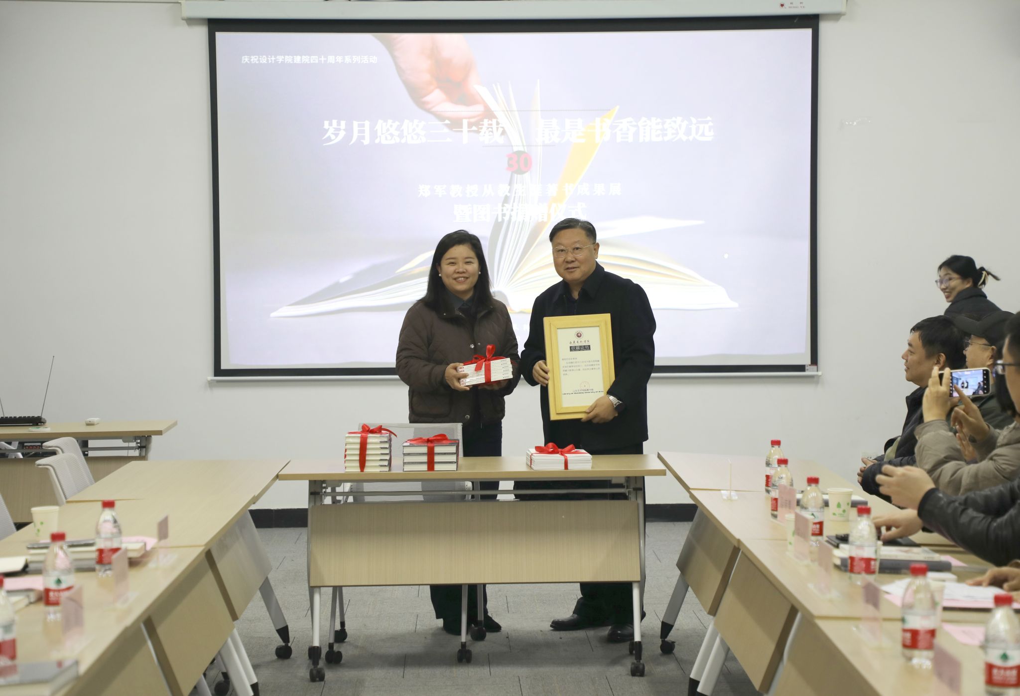 11月25日,郑军教授从教生涯著书成果展及图书捐赠仪式在设计学院会议室举行。学校党委委员、副院长荆雷,党委委员、宣传部部长孔宪坤出席活动。科研处、图书馆负责人,艺术研究院相关负责人,设计学院党政班子成员、师生代表、校友代表参加活动。