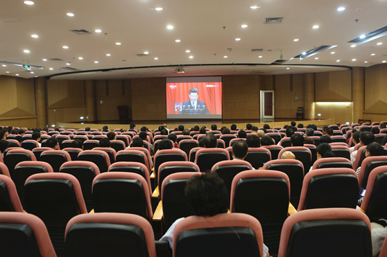 党员干部和师生在长清校区图书馆报告厅观看庆祝中国共产党成立95周年大会实况直播