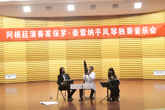 此次音乐会是中国音乐家协会手风琴学会举办的“2016中国手风琴交流年”系列活动之一。音乐会上,保罗·豪雷纳充满激情地为大家演奏了《只差一步》《化装舞会》《再见诺尼诺》等多首经典的阿根廷探戈手风琴乐曲。保罗·豪雷纳还与我校音乐学院牟楠副教授、保罗·豪雷纳的学生王丹女士合作演出了三重奏作品《卷珠帘》(保罗·豪雷纳改编的探戈风格的中国作品),几位演奏家的合作可谓和谐默契,跨越了历史和时空,融合了两国文化的特质,舞台上以对话的形式,在现场观众心中产生了强烈共鸣。