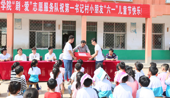 5月30日,山东艺术学院团委、戏剧影视学院学生党支部的师生与“第一书记”帮包村小学的同学们共度六一儿童节,举行“山东艺术学院爱心书屋”揭牌仪式,把精心准备的爱心书籍赠送给孩子们。爱心书屋首次捐赠图书700余册,图书的部分资金来自“诚信·爱心”冰柜的经营收入。作为戏剧影视学院首个“学生党员先锋岗”,“诚信·爱心”冰柜以无人看守自觉投币的经营模式,以扶困济危为目的而建立起来,由共产党员和入党积极分子组成维护和经营人员。他们牺牲个人时间,在实际操作中,进货、上货、清算销售情况,不能有一点马虎,营业额、盈亏情况都要十分精确。此次活动是“两学一做”学习教育的具体举措,这一行动使团员青年的政治理论学习与志愿服务得到统一、“学”和“做”结合更加紧密,培养了艺苑学子的社会责任感和奉献精神。