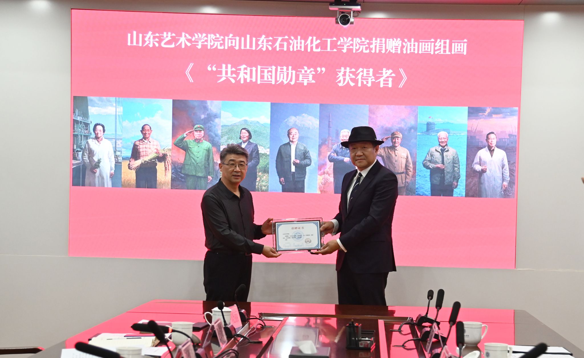 徐青峰介绍了学校的基本情况以及油画组画《“共和国勋章”获得者》的创作过程、传递的时代精神和以美育人的独特价值与作用。他指出,本次捐赠油画组画并与山东石油化工学院签署合作框架协议,一方面是向“共和国勋章”获得者致敬,在新时代传承发挥好美育作用,培养更多德智体美劳全面发展的应用型人才;另一方面是以此为契机,进一步强化校际交流,赓续彼此友谊,发挥优势资源,在更高层次、更广领域、更大平台开展务实合作,提高双方师资队伍建设、学科专业建设、教学科研水平,全面增强服务区域发展和国家战略能力,共同谱写事业发展新篇章。