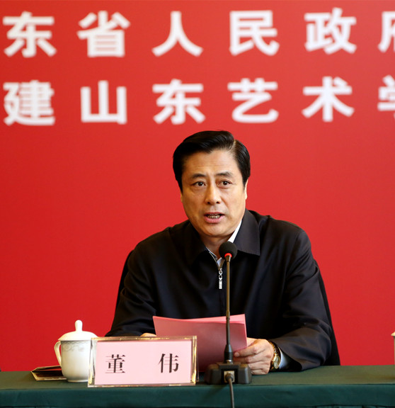 董伟代表文化部、代表雒树刚部长,对活动表示热烈的祝贺。他指出,文化部与山东省人民政府签署共建山东艺术学院协议,是贯彻科教兴国、人才强国和文化强国战略,推进山东高等教育事业发展、促进山东文化建设的一项重大举措。文化部将认真落实协议内容,积极关注、支持山东艺术学院,加大对学校改革发展的指导力度,推进学校与文化系统和文化行业的深度联系,为学校发展提供有力的支撑。习近平总书记的系列讲话为文化工作、艺术教育指明了方向。希望山东艺术学院紧紧抓住省部共建的有利契机,认真贯彻落实习近平总书记讲话精神,贯彻落实党的教育方针和文艺方针,紧密对接国家和山东的重大文化战略需求,紧密联系文化艺术发展需要,积极探索服务区域文化发展的有效机制,努力办好人民满意的艺术教育,为文化艺术繁荣发展提供人才和智力支持,为国家和山东省的经济社会进步、文化艺术繁荣发展作出新的更大贡献。