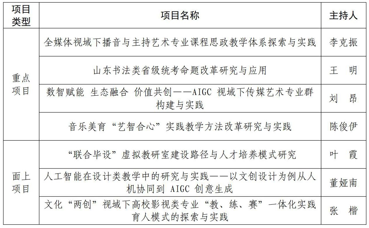 本次获批的省级教学改革研究项目,聚焦课程思政建设、专业群建设、实践教学改革、人工智能赋能、美育通识课程创新等高等教育改革发展的关键领域和挑战性议题,致力于深入探究新时代艺术人才培养新模式和新策略,为落实立德树人根本任务、提升学校本科教学综合改革效能注入强劲动力。