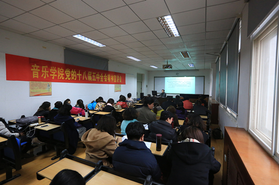 11月19日下午,音乐学院贯彻落实党的十八届五中全会精神宣讲会在文东校区教学楼召开,音乐学院党总支书记郝益军作专题宣讲,学校学生工作处处长成慧青、音乐学院全体教师、学生代表参加本次宣讲会,会议由音乐学院院长李云涛主持。